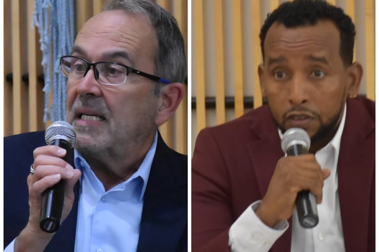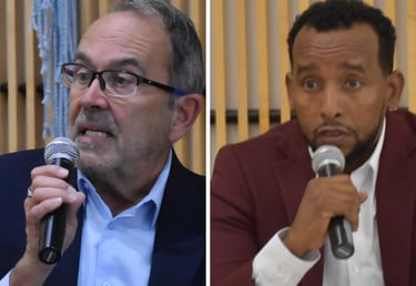 Stearns County commissioner candidates Bob Johnson, left, and Amin Ali address residents at a meet and greet at the Great River Regional Library in St. Cloud on Tuesday, Sept. 30, 2025.